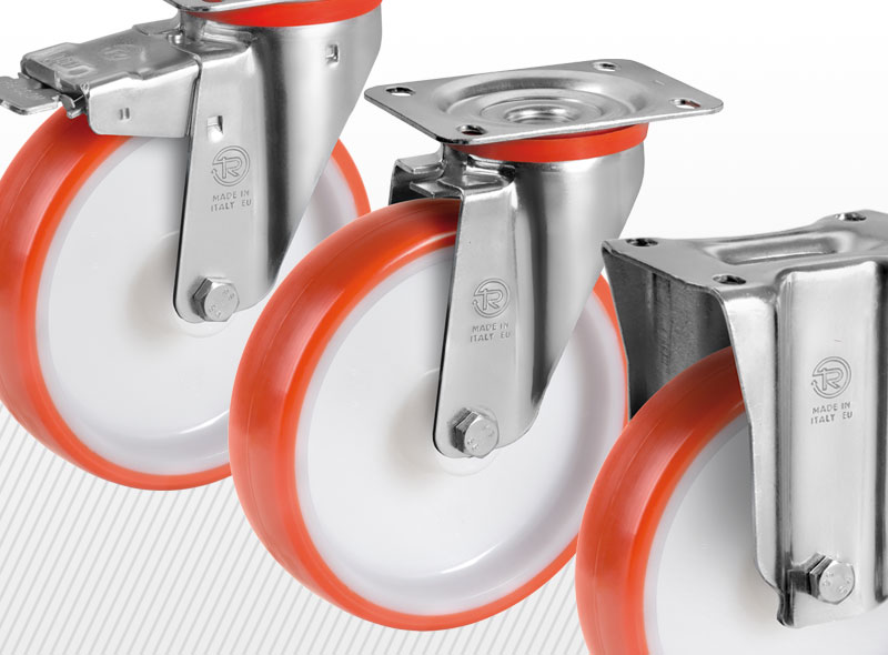 Poliuretán futófelületű, "Poliamid 6" agyú kerék, sikló, görgős, illetve rozsdamentes görgős csapágyazással. A futófelületet keménysége 55 Shore D, kitűnő a gördülési ellenállása, nagy a rugalmassága, magas a kopásállósága és a szakító szilárdsága.